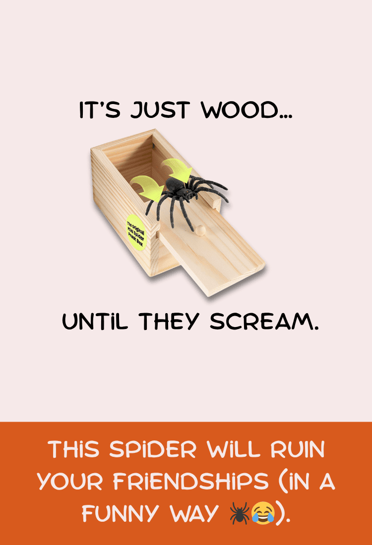 The harmless prank spider that causes maximum chaos with zero bites. Made of wood, but your friends won’t notice when they jump 2 meters high.
